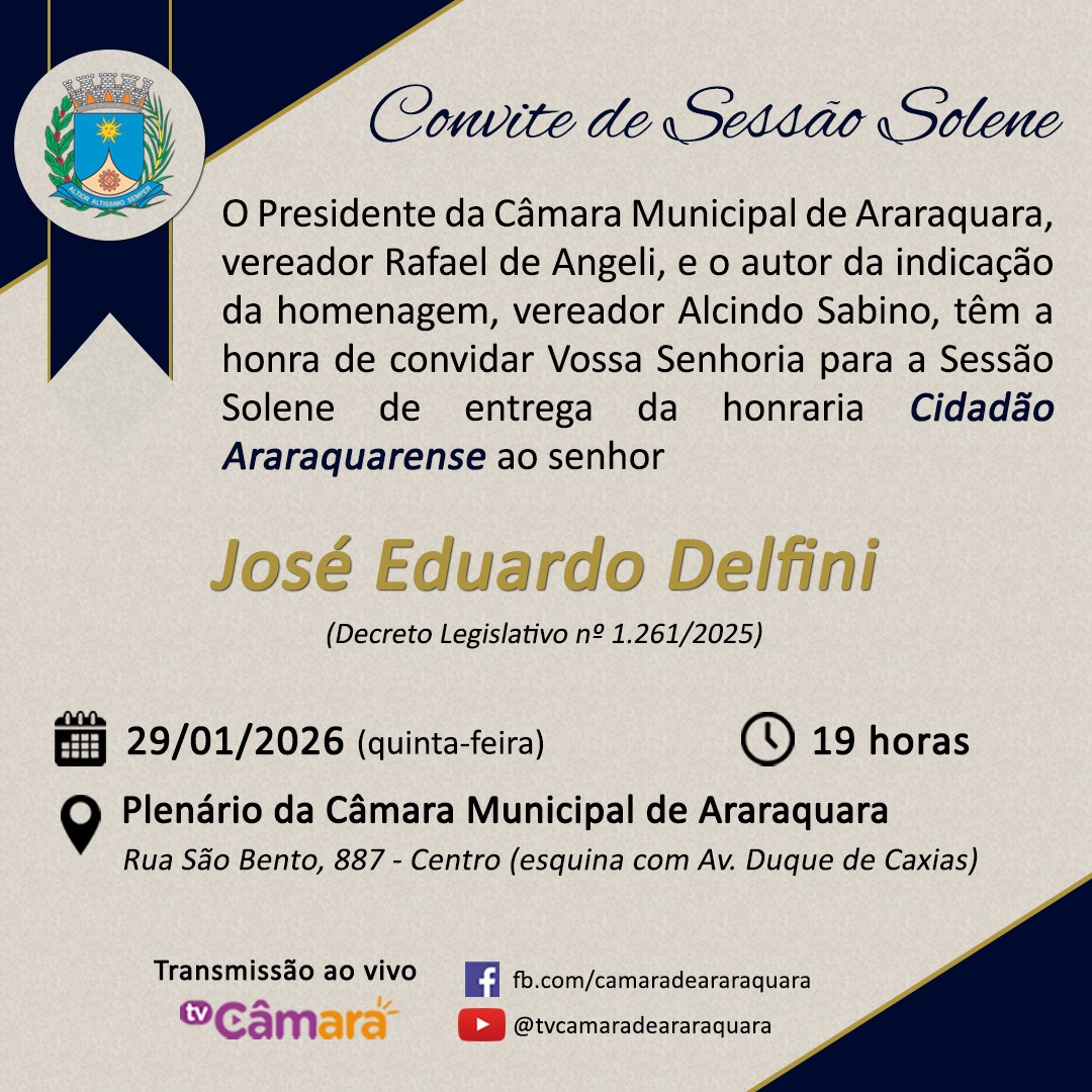 O presidente da Câmara Municipal de Araraquara, vereador Rafael de Angeli, e o autor da indicação da homenagem, vereador Alcindo Sabino, têm a honra de convidar para a Sessão Solene de entrega da honraria de Cidadão Araraquarense ao senhor José Eduardo Delfini - conforme Decreto Legislativo nº 1261/2025.