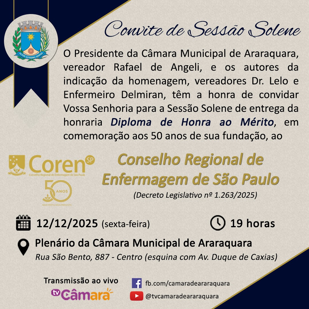 O presidente da Câmara Municipal de Araraquara, vereador Rafael de Angeli, e os autores da indicação da homenagem, vereadores Dr. Lelo e Enfermeiro Delmiran, têm tem a honra de convidar para a Sessão Solene de entrega da honraria Diploma de Honra ao Mérito ao Conselho Regional de Enfermagem de São Paulo (COREN-SP), em celebração dos 50 anos de sua fundação - conforme Decreto Legislativo nº 1263/2025.