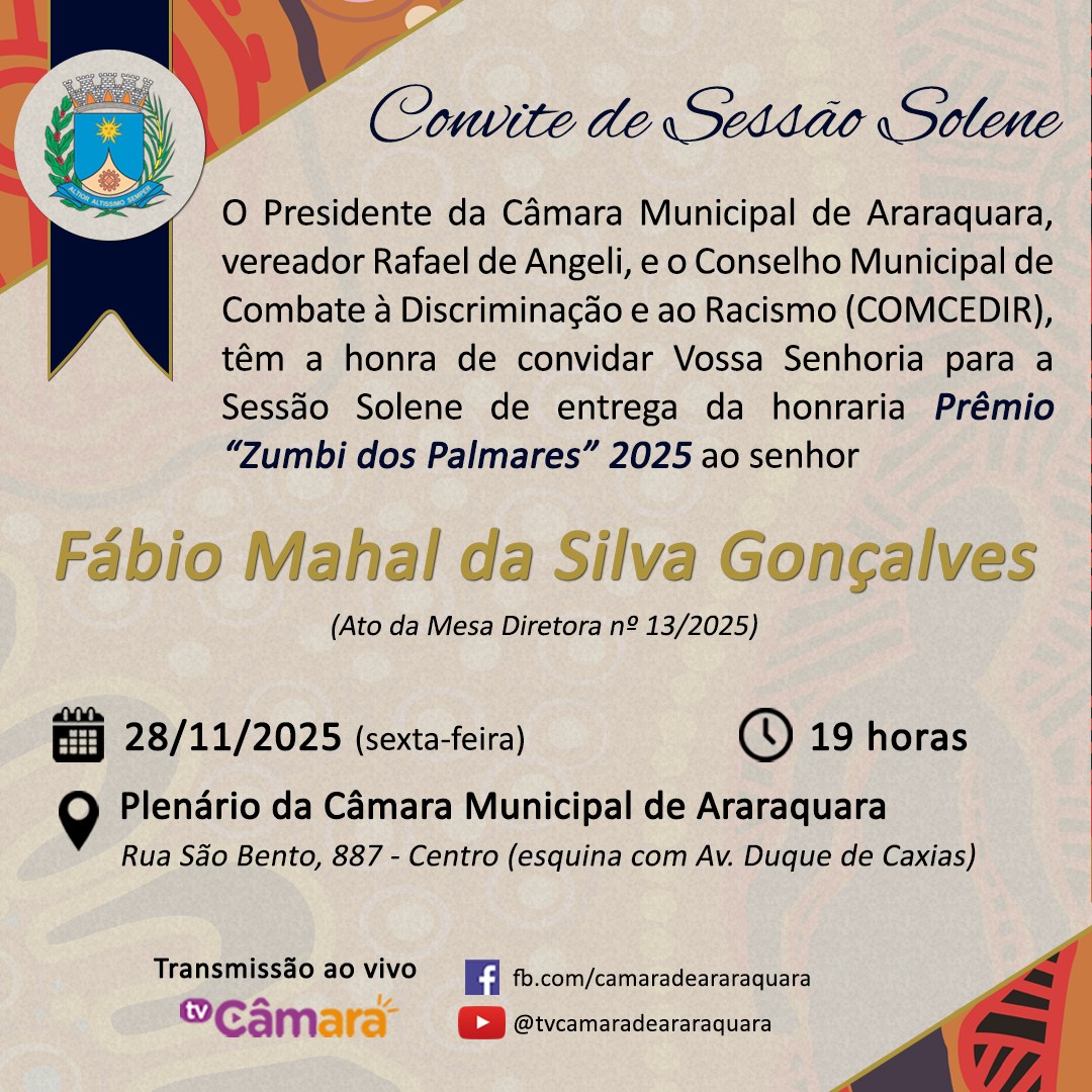 O presidente da Câmara Municipal de Araraquara, vereador Rafael de Angeli, e o Conselho Municipal de Combate à Discriminação e ao Racismo de Araraquara (COMCEDIR), têm a honra de convidar vossa senhoria para a Sessão Solene de entrega da honraria Prêmio "Zumbi dos Palmares" 2025 ao senhor Fábio Mahal da Silva Gonçalves - conforme Ato da Mesa Diretora nº 13/2025.