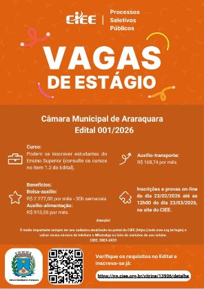 A Câmara Municipal de Araraquara está com inscrições abertas para o Processo de Seleção Pública de Estagiários – Edital nº 001/2026. A seleção é organizada pelo Centro de Integração Empresa-Escola (Ciee) e visa a formar cadastro de reserva para estudantes de nível superior, matriculados a partir do 1º semestre. Há oportunidades para os cursos de Direito, Jornalismo e Comunicações, Publicidade e Propaganda, Propaganda e Marketing, Imagem e Som, Logística, Ciências Econômicas, Administração, Gestão Financeira, Administração Pública, Gestão Comercial, Gestão Pública e Ciências Sociais.