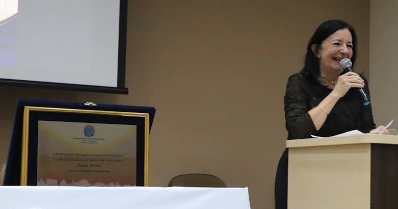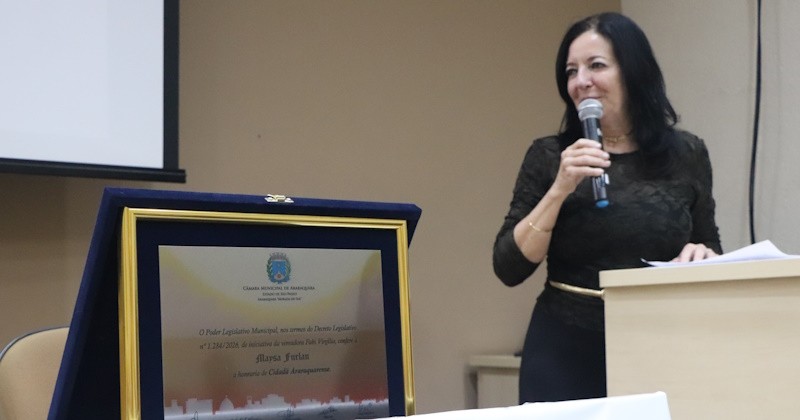 Na noite de quarta-feira (15), a Câmara Municipal homenageou a reitora da Universidade Estadual Paulista (Unesp), Maysa Furlan, com o Título de Cidadã Araraquarense. A honraria foi proposta pela vereadora Fabi Virgílio (PT) e entregue em Sessão Solene da Assembleia Legislativa do Estado de São Paulo, realizada no Instituto de Química da Unesp Araraquara (IQ) em comemoração aos seus 65 anos de fundação, por indicação da deputada estadual Márcia Lia (PT).