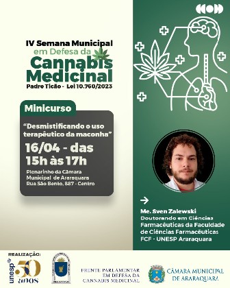 Na quinta-feira (16), das 15 às 17 horas, no Plenarinho da Casa de Leis, tem o minicurso “Desmistificando o uso terapêutico da maconha”, com Sven Zalewski, doutorando em Ciências Farmacêuticas da FCF da Unesp Araraquara.