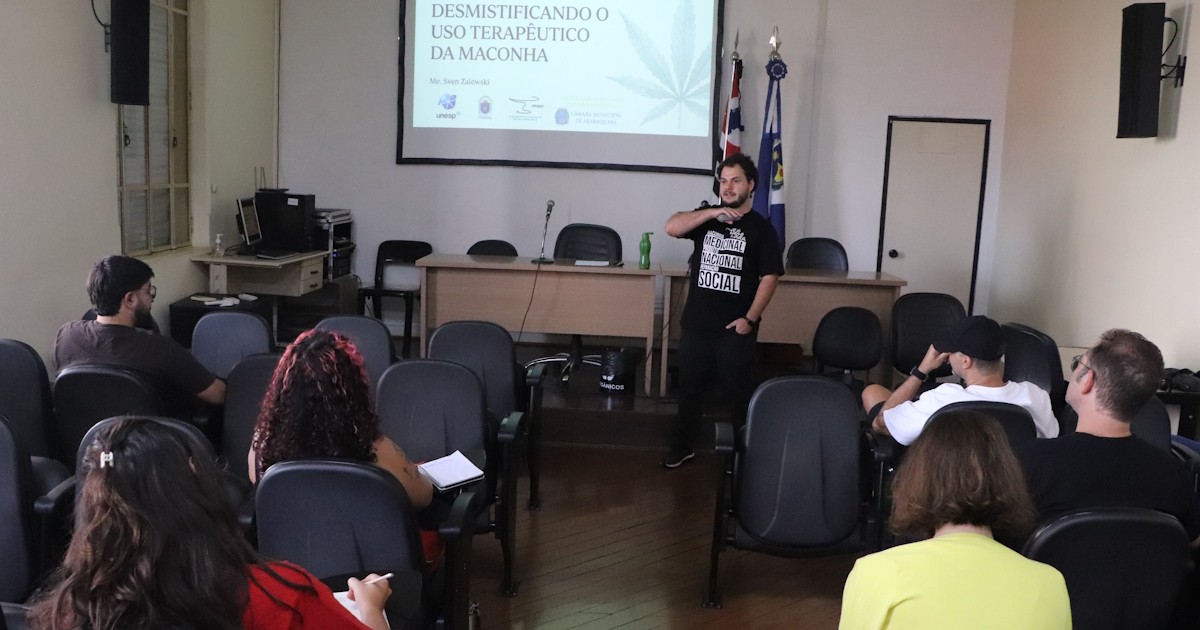 O Plenarinho da Câmara de Araraquara recebeu na tarde desta quinta-feira (16), o minicurso “Desmistificando o uso terapêutico da maconha”, com Sven Zalewski, doutorando da Faculdade de Ciências Farmacêuticas (FCF) da Universidade Estadual Paulista (Unesp) Araraquara. A atividade faz parte da programação da IV Semana Municipal em Defesa da Cannabis Medicinal “Antonio Luiz Marchioni – Padre Ticão” e foi aberta pela presidente da Frente Parlamentar em Defesa da Cannabis Medicinal, vereadora Fabi Virgílio (PT).