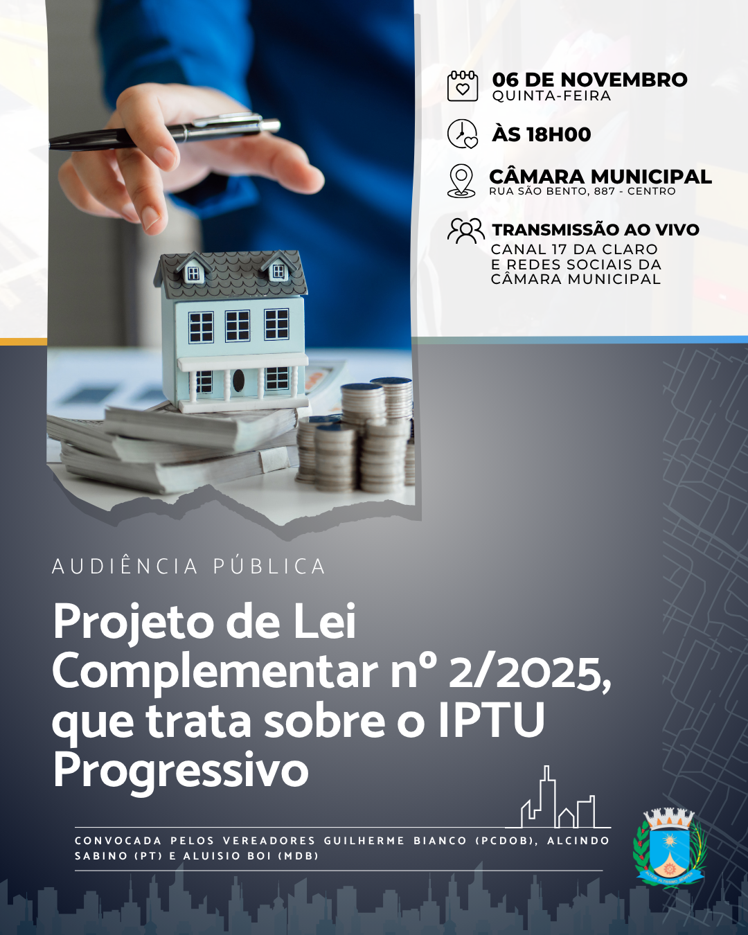 A Câmara Municipal de Araraquara convida para participar da audiência pública para debater sobre o Substitutivo nº 1 ao Projeto de Lei Complementar nº 2/2025, que trata da aplicação do IPTU Progressivo no Tempo. Requerida pelos vereadores Guilherme Bianco (PCdoB), Alcindo Sabino (PT) e Aluisio Boi (MDB) — requerimento nº 1907/2025 —, a audiência será transmitida ao vivo pela TV Câmara (canal 17 da Claro), pelo Facebook e pelo YouTube.