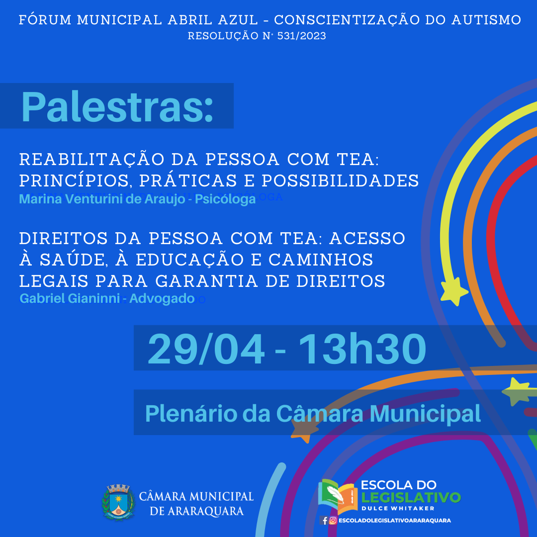 A Escola do Legislativo de Araraquara realizará, no dia 29 de abril, o Fórum Municipal Abril Azul – Conscientização do Autismo, iniciativa voltada à promoção do diálogo, da informação e do fortalecimento dos direitos das pessoas com Transtorno do Espectro Autista (TEA).