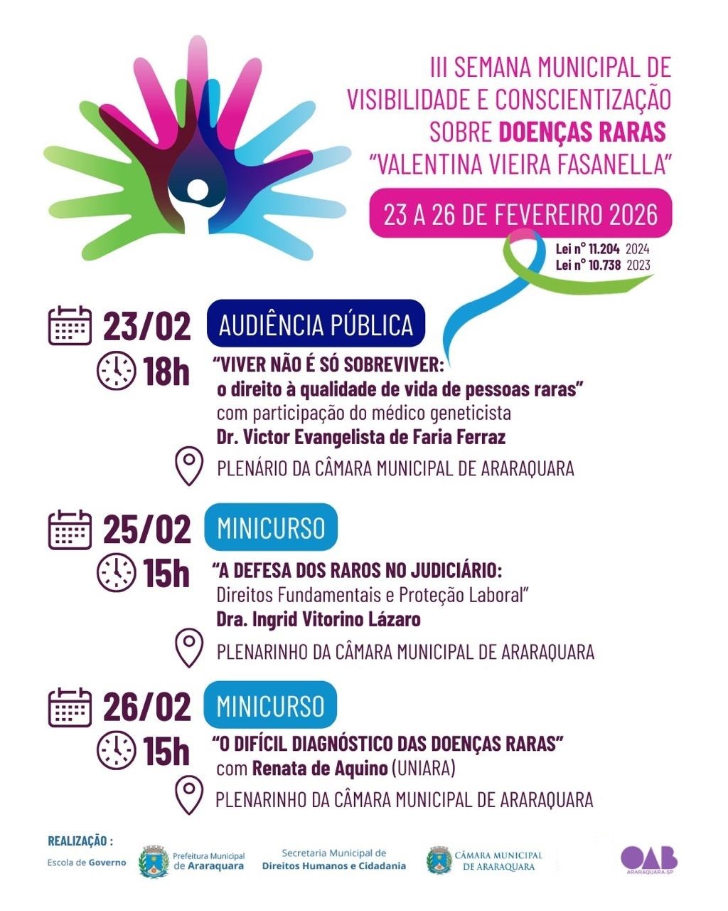 - 23/02 às 18h (segunda-feira) | Audiência Pública "Viver não é só sobreviver: O Direito à qualidade de vida de pessoas raras" com o Dr. Victor Evangelista de Faria Ferraz. No Plenário da Câmara Municipal de Araraquara, na Rua São Bento, 887 - Centro.