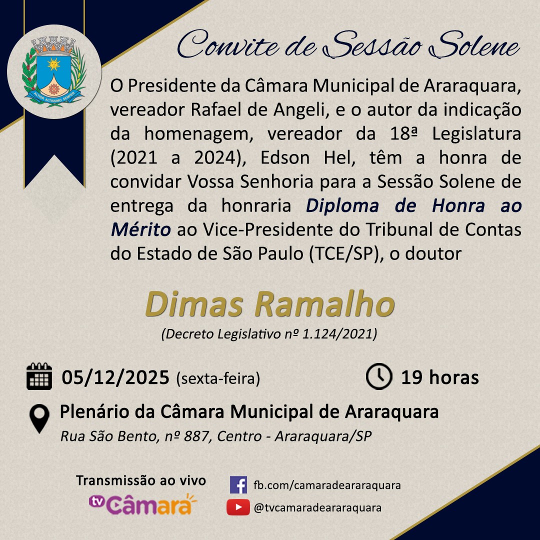 O presidente da Câmara Municipal de Araraquara, vereador Rafael de Angeli, e o autor da indicação da homenagem, vereador da 18ª Legislatura (2021 a 2024), Edson Hel, têm a honra de convidar para a Sessão Solene de entrega da honraria Diploma de Honra ao Mérito ao vice-presidente do Tribunal de Contas do Estado de São Paulo (TCESP), doutor Dimas Eduardo Ramalho - conforme Decreto Legislativo nº 1.124/2021.