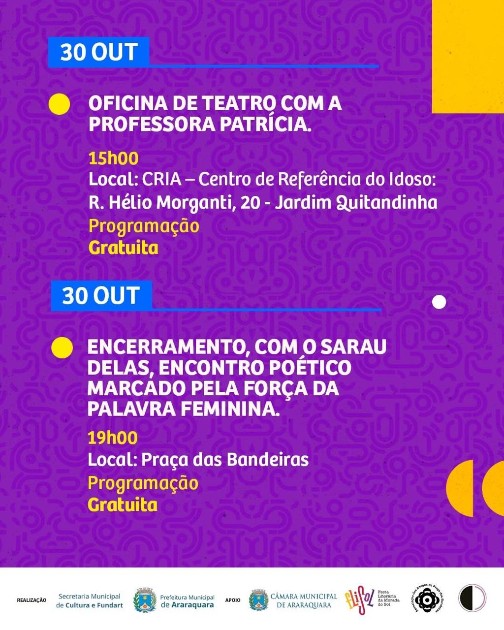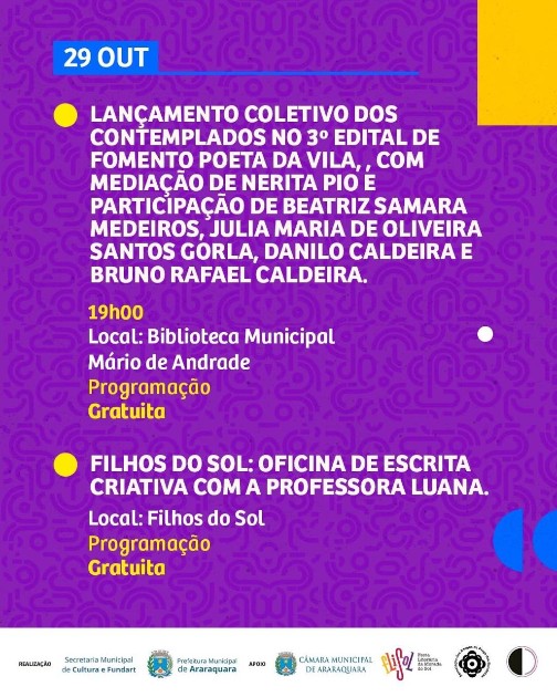 A atividade faz parte da programação da “Semana Municipal de Poesia – José Roberto Tellaroli, o poeta da Vila”, instituída pela Lei 10.452, de 2022, e comemorada anualmente na última semana de outubro.