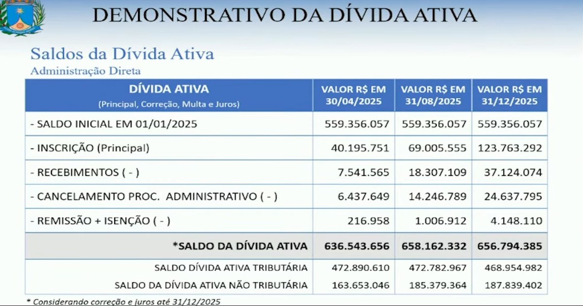 Na ocasião, a Prefeitura exibiu quadro com detalhamento sobre a dívida ativa: o campo informativo “cancelamento processo administrativo” na dívida ativa encerrou o ano passado com o total de R$ 24.637.795 (veja imagem nesta matéria).